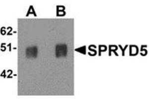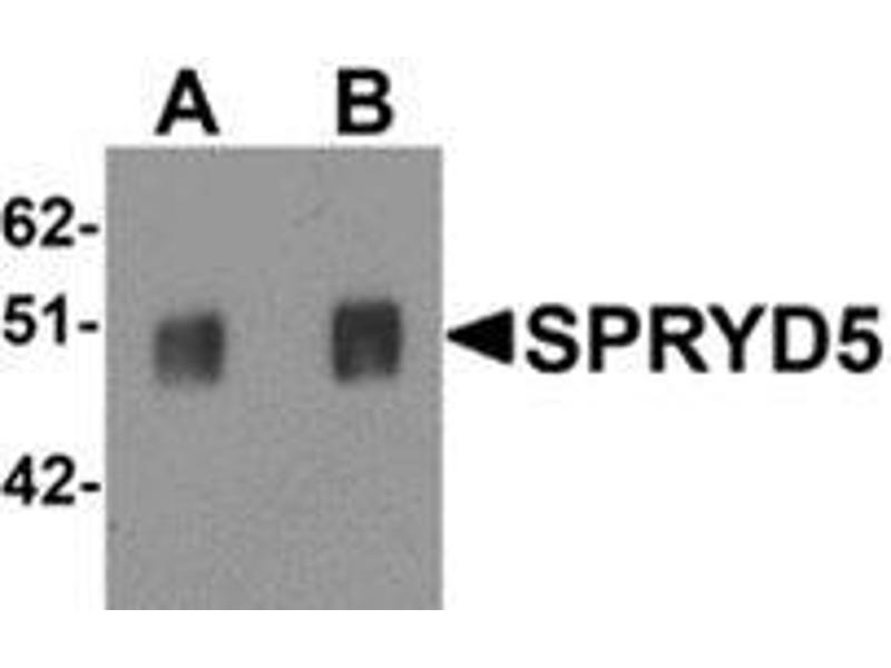The SPRY domain-containing protein 5 (SPRYD5) is a member of a family of proteins whose sole common characteristic is the presence of a SPRY domain. SPRY domains are structural domains that were first described in the fungal Dictyostelium discoideum tyrosine kinase spore lysis A. In most systems SPRY domains provide binding sites for regulatory proteins or intramolecular binding sites that maintain the structural integrity of a protein. SPRYD5 belongs to the TRIM/RBCC family and contains one B box-type zinc finger, one B30.2/SPRY domain and one RING-type zinc finger. Little is known of the function of the SPRYD5 protein.Synonyms: SPRY domain-containing protein 5, Tripartite motif-containing protein 51
