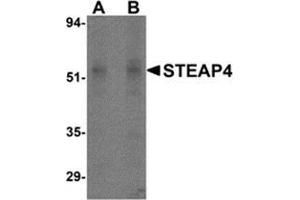 The six-transmembrane epithelial antigen of prostate 4 (STEAP4) is a member of a family of metalloreductases identified as cell-surface antigens in prostate tissue. Similar to two other members of the STEAP family (STEAP 2 and STEAP3), STEAP4 promotes both iron and copper reduction. STEAP4 is highly expressed in placenta, lung, heart and prostate tissues, and overexpressed in prostate cancer cells compared to normal prostate cells. Overexpression of STEAP4 in prostate cells significantly increases cell growth and colony formation, suggesting STEAP4 may have a role in cell proliferation and prostate cancer progression. At least two isoforms are known to exist for this protein. This STEAP4 antibody does not cross-react with other STEAP proteins.Synonyms: Metalloreductase STEAP4, STAMP2, STEAP-4, Six-transmembrane epithelial antigen of prostate 4, SixTransMembrane protein of prostate 2, TNFAIP9, Tumor necrosis factor, alpha-induced protein 9