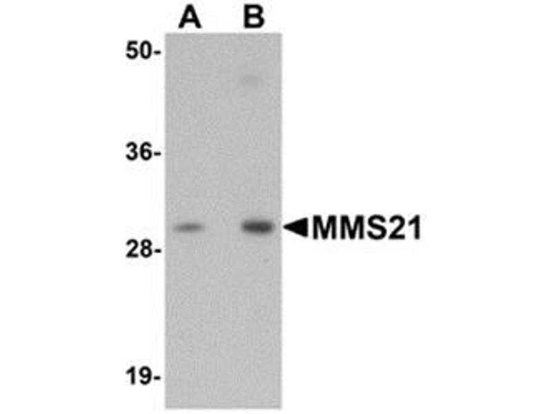 MMS21, also known as NSE2, is a SUMO ligase that in combination with the SMC5/6 complex is required for the prevention of DNA damage induced apoptosis by facilitating DNA repair in human cells. MMS21-dependent sumoylation is integral and important to the cohesion mechanism and mitotic progression, this function appears to be independent of SMC6. MMS21 mediates SUMO attachment to various proteins such as SMC6L1 and TRAX, and possibly the cohesin components RAD21 and STAG2.Synonyms: C8orf36, E3 SUMO-protein ligase NSE2, MMS21