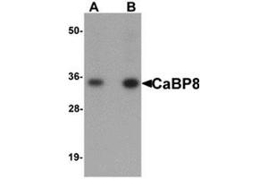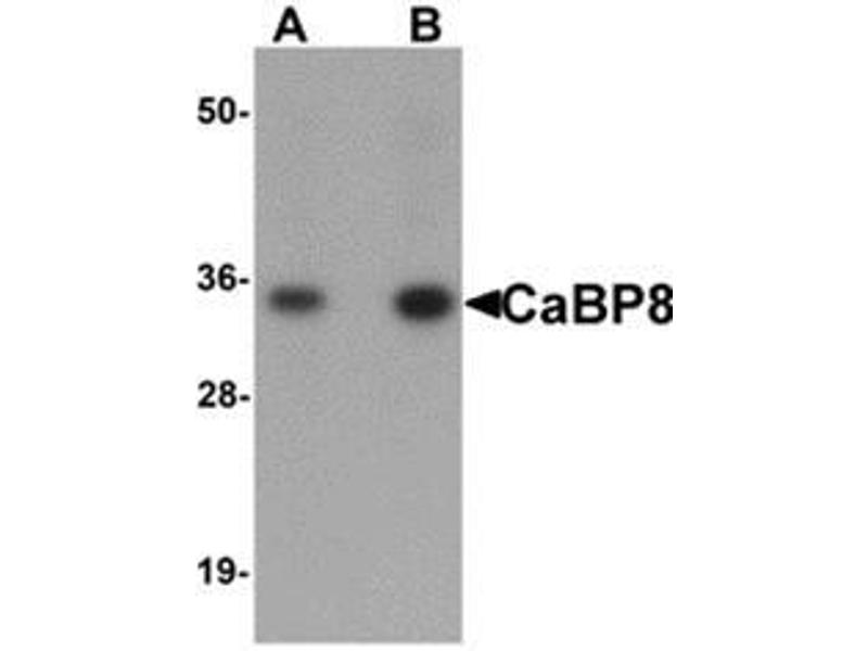 Calcium binding proteins (CaBP) play a crucial role in the calcium-mediated cellular signal transduction pathway in the central nervous system. The CaBP family shares much similarity with CaM I (calmodulin), and it has been shown that CaBP proteins can substitute functionally for, and possibly augment the function of, CaM I. CaBP8, contains two EF-hand domains for calcium binding and shares 70 % homology with CaBP7 and 50 % homology with CaM I. It negatively regulates Golgi-to-plasma membrane trafficking by interacting with PI4KB and inhibiting its activity. Both CaBP8 and CaBP7 possess a targeting mechanism that is unique amongst the CaBPs that may contribute to differential functional Ca2+-sensing by these family members.Synonyms: CABP8, CALN1, Calcium-binding protein CaBP8