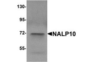 NALP proteins are cytoplasmic proteins that form a subfamily within the larger CATERPILLER family and are thought to play a crucial role in cell proliferation and reproduction. Like all other NALP family members, NALP10 has a C-terminal leucine-rich repeat (LRR) region, an N-terminal Pyrin domain (PYD) followed by a NACHT domain, and a NACHT-associated domain. It was initially identified as PYNOD, an Apaf-1-like protein that binds to ASC, caspase-1 and IL-1b, inhibiting the autoprocessing of caspase-1, caspase-1-mediated IL-1b processing, and ASC aggregation. NALP10 is thus a potent regulator of apoptosis and inflammation.Synonyms: NACHT LRR and PYD domains-containing protein 10, NALP10, NOD8, Nucleotide-binding oligomerization domain protein 8, PYNOD