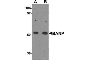 - BANP was initially identified as a binding protein to BTG3 in a yeast two-hybrid screen. BANP acts as a tumor suppressor by stabilizing p53 expression and leading to cell cycle arrest. p53 in turn binds to upstream elements of the BANP promoter, thereby forming a feedback loop. BANP is down-regulated in advanced stages of human breast cancer, and its overexpression in breast cancer cell lines inhibits their ability to metastasize by modulating TGF-b signaling. Furthermore, BANP can modulate NF-kB transactivation and can inhibit tumorigenesis by regulating NF-kB target genes. Recent experiments have shown that BANP can also repress HIV-1 LTR mediated transcription by tethering the LTR matrix attachment region to nuclear matrix.Synonyms: BEN domain-containing protein 1, BEND1, Btg3-associated nuclear protein, Scaffold/matrix-associated region-1-binding protein