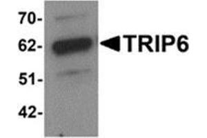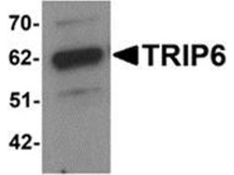 TRIP6 (Thyroid receptor interacting protein 6) is a zyxin-related focal adhesion molecule involved in cell motility and antiapoptotic responses. TRIP6 is predominantly expressed in kidney, liver and lung. It has three LIM domains, a PDZ-binding motif, a Crk SH2-binding motif and/or other protein interacting domains. TRIP6 regulates NF-kB activation and interacts with RICK and TRAF2, proteins that are involved in TNF signaling. TRIP6 antagonizes Fas-induced apoptosis and promotes Fas-mediated cell migration in apoptosis-resistant glioma cells via Src-dependent phosphorylation of TRIP6 at Tyr-55.Synonyms: OIP-1, OPA-interacting protein 1, TRIP-6, ZRP-1, Zyxin-related protein 1