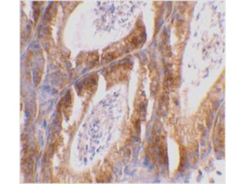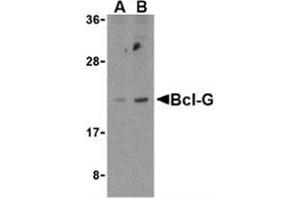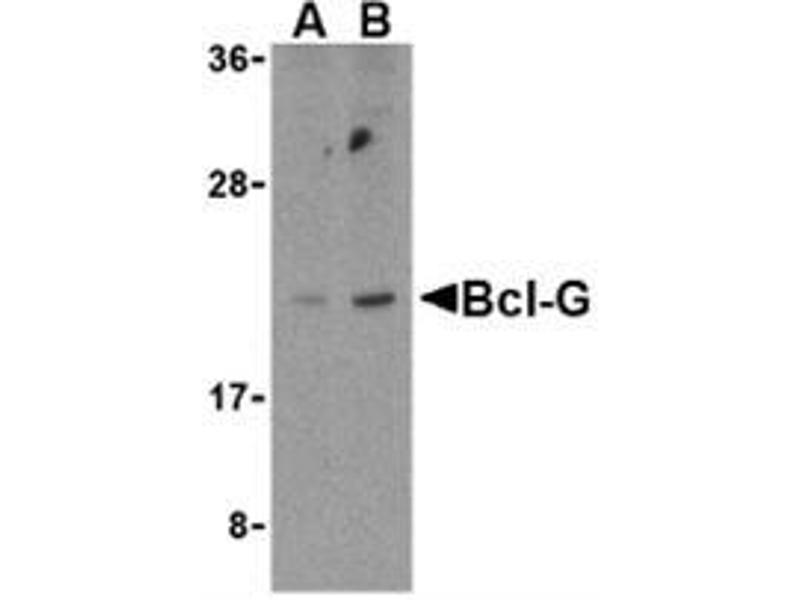 Members in the Bcl-2 family are critical regulators of apoptosis by either inhibiting or promoting cell death. Bcl-2 homology 3 (BH3) domain is a potent death domain (reviewed in 1 and 2). BH3 domain containing pro-apoptotic proteins, including Bad, Bax, Bid, Bik, and Hrk, form a growing subclass of the Bcl-2 family. A novel BH3 domain containing protein was recently identified and designated Bcl-G (3). The mRNA of Bcl-G encodes 2 isoforms, Bcl-GL, which is widely expressed in multiple tissues, and Bcl-GS, which is only found in testis. The Bcl-GS protein is predominantly localized to cytoplasmic organelles whereas Bcl-GL was distributed throughout the cytosol. Overexpression of either protein induced apoptosis, although Bcl-GS was far more potent than Bcl-GS. Apoptosis induction was dependent on the BH3 domain and could be suppressed by co-expression with the anti-apoptotic Bcl-XL protein (3).Synonyms: Apoptosis facilitator Bcl-2-like protein 14, BCL2L14, BCLG, Bcl-G, Bcl2-L-14