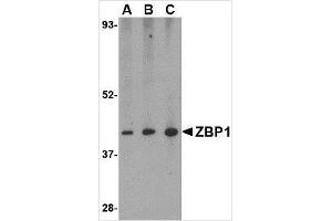 Z-DNA binding protein 1 (ZBP1) belongs to a family of proteins that contain the Za domain which binds specifically to left-handed Z-DNA and Z-RNA. ZBP1 was initially identified as a novel gene that was up-regulated in activated macrophages in mice bearing ascites tumors, suggesting that is may play a role in processes such as host response in neoplasia. More recent reports indicate that the cytosolic ZBP1 has can act like the toll-like receptor TLR9 by detecting cytosolic double-stranded (ds) DNA and trigger induction of type I interferon and other innate immune responses. It is thought that the binding of ZBP1 to dsDNA enhances its association with innate immune response proteins such as the IRF3 transcription factor and the serine/threonine kinase TBK1 (also known as NAK). Multiple isoforms of ZBP1 are known to exist.Synonyms: C20orf183, DLM1, Z-DNA-binding protein 1