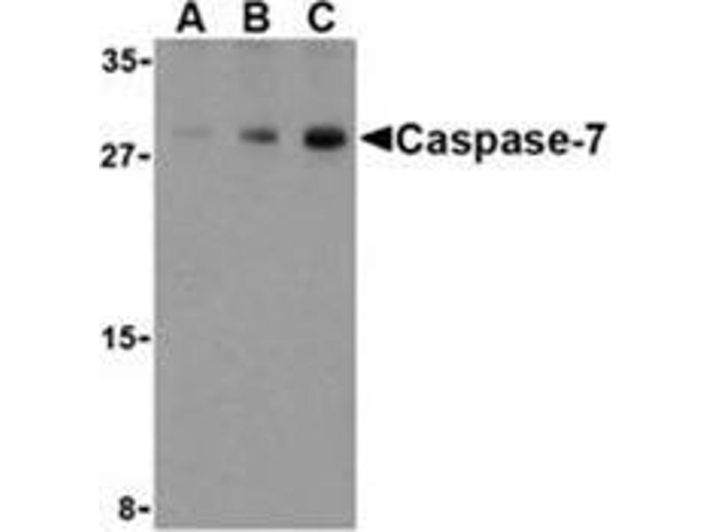 Caspases are a family of cysteine proteases that can be divided into the apoptotic and inflammatory caspase subfamilies. Unlike the apoptotic caspases, members of the inflammatory subfamily are generally not involved in cell death but are associated with the immune response to microbial pathogens (reviewed in 1 and 2). The apoptotic subfamily can be further divided into initiator caspases, which are activated in response to death signals, and executioner caspases, which are activated by the initiator caspases and are responsible for cleavage of cellular substrates that ultimately lead to cell death (reviewed in 3). Caspase-7 is an executioner caspase that was identified based on its homology with caspases 1 and 3, as well as the C. elegans cell death protein CED-3 (4). Alternative splicing of Caspase-7 mRNA results in the production of 3 distinct isoforms (4). Caspase-7 activity can be directly inhibited by XIAP expression (5).Synonyms: Apoptotic protease Mch-3, CASP-7, CASP7, CMH-1, ICE-like apoptotic protease 3, MCH3