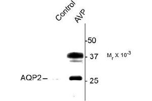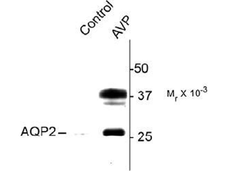 Specific for ~29k AQP2 protein phosphorylated at Ser264. This antibody also recognizes the glycosylated form of AQP2 at ~37k. Immunolabeling of the AQP2 band is blocked by preadsorption with the phospho-peptide used as antigen but not by the corresponding dephospho-peptide.