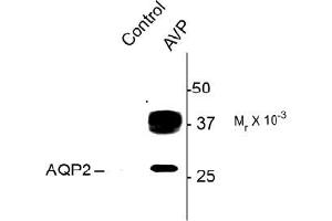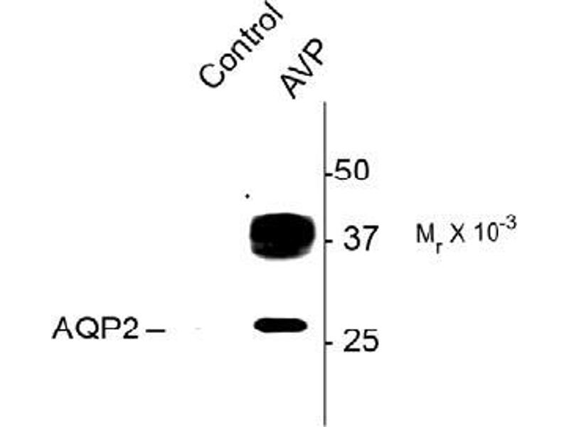 Specific for ~29k AQP2 protein phosphorylated at Ser269. This antibody also recognizes the glycosylated form of AQP2 at ~37k. Immunolabeling of the AQP2 band is blocked by preadsorption with the phospho-peptide used as antigen but not by the corresponding dephospho-peptide.