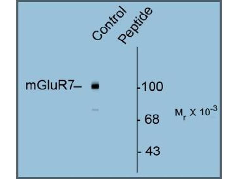 Metabotropic glutamate receptors (mGluRs) are key receptors in the modulation of excitatory synaptic transmission in the central nervous system. They are implicated in many forms of neural plasticity as well as learning and memory and drug abuse (Bhattacharya et al., 2004, Francesconi et al., 2004, Wilson and Nicoll, 2001). The mGluRs are divided into three groups based on sequence identity and pharmacological properties: group I (mGluR1 and mGluR5) are localized in the perisynaptic region of the postsynaptic membrane, whereas group II (mGlur2 and mGluR3) and group III (mGluR4,6,7 and 8) are localized predominantly at presynaptic terminals. PKC phosphorylation of serine 862 on mGluR7 has been shown to be critical for stabilizing receptor surface expression and promoting binding to the synaptic PDZ-domain-containing protein PICK1 (Suh et al., 2008).Synonyms: GPRC1G, MGLUR7, Metabotropic glutamate receptor 7