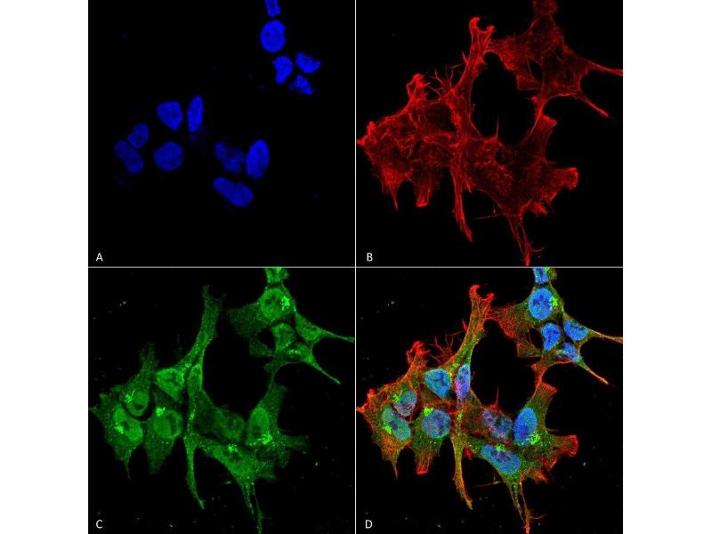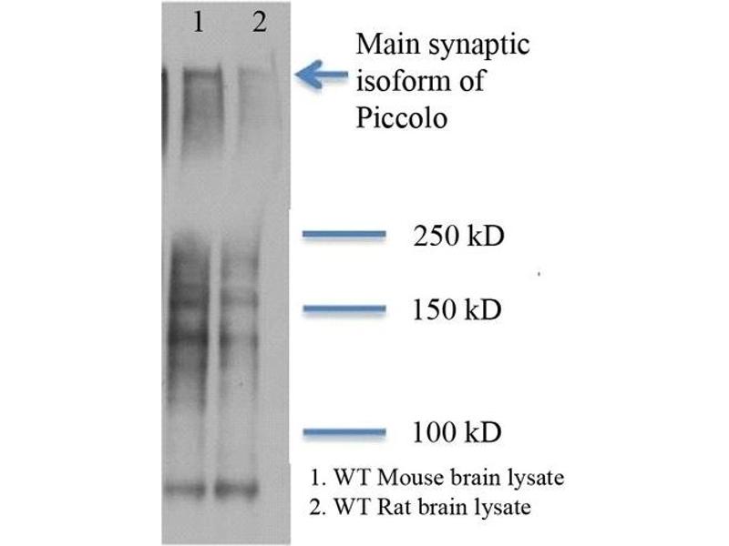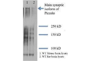 1 μg/ml of ABIN863104 was sufficient for detection of Piccolo in 20 μg of rat brain tissue lysate by colorimetric immunoblot analysis using goat IgG:HRP as the secondary antibody.
