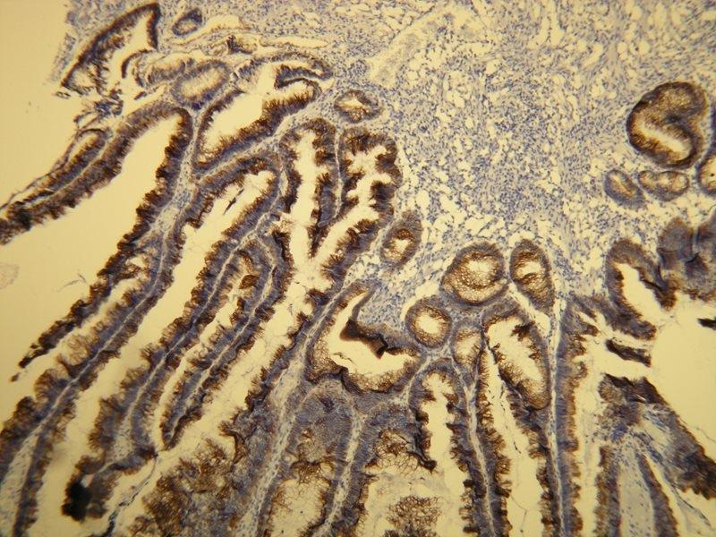CK20 is a low molecular weight acidic cytokeratin which expression is tightly connected to gastric and intestinal epithelium, urothelium and Merkel cells of the skin. It is commonly found in colorectal cancer, Merkel cell tumors and transitional cell carcinomas.