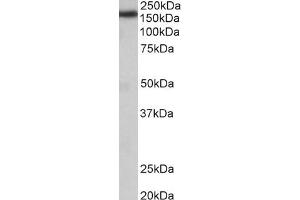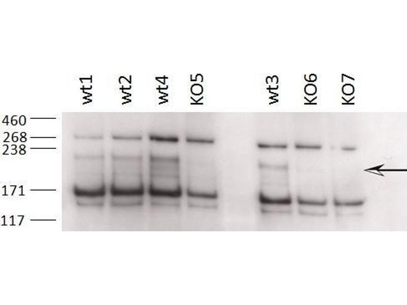 Western Blot: Approx 170 kDa band observed in Rat Brain lysates (calculated MW of 163 kDa according to Rat NP_001101423.1 and 185 kDa according to Mouse NP_780681.2). Recommended concentration: 0.03-0.1 μg/mL. Approx 200 kDa band observed in Mouse Testis lysa