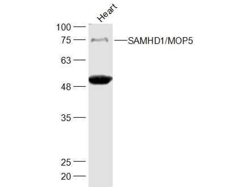 Background: Putative nuclease involved in innate immune response by acting as a negative regulator of the cell-intrinsic antiviral response. May play a role in mediating proinflammatory responses to TNF-alpha signaling.Tissue specificity:Expressed in heart, skeletal muscle, spleen, liver, small intestine, placenta, lung and peripheral blood leukocytes. No expression is seen in brain and thymus.Involvement in disease:Defects in SAMHD1 are the cause of Aicardi-Goutieres syndrome type 5 (AGS5) . A form of Aicardi-Goutieres syndrome, a genetically heterogeneous disease characterized by cerebral atrophy, leukoencephalopathy, intracranial calcifications, chronic cerebrospinal fluid (CSF) lymphocytosis, increased CSF alpha-interferon, and negative serologic investigations for common prenatal infection. Clinical features as thrombocytopenia, hepatosplenomegaly and elevated hepatic transaminases along with intermittent fever may erroneously suggest an infective process. Severe neurological dysfunctions manifest in infancy as progressive microcephaly, spasticity, dystonic posturing and profound psychomotor retardation. Death often occurs in early childhood.