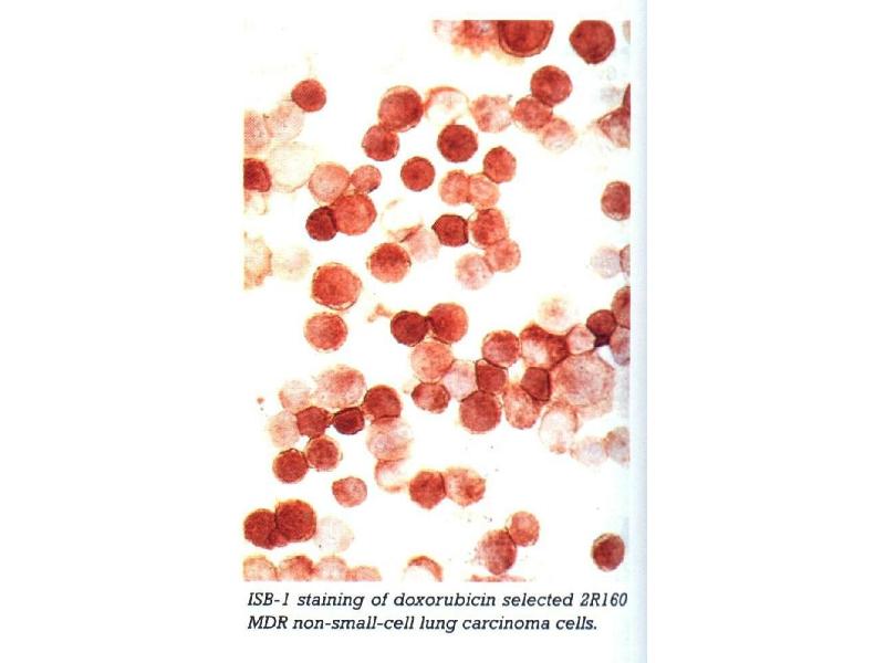 JSB-1 reacts with a conserved cytoplasmic epitope of the human plasma membrane- associated 170-180 kDa glycoprotein, the expression of which is strongly correlated with the degree of multidrug resistance (MDR) derived MDR cell lines and human MDR cell lines, including cell lines derived from lung, ovaries and B cell lymphomas.