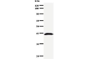 This gene encodes a transcription factor that contains a cyclin D-binding domain, three central Myb-like repeats, and two flanking acidic transactivation domains at the N- and C-termini. The encoded protein is induced by the oncogenic Ras signaling pathway and functions as a tumor suppressor by activating the transcription of ARF and thus the ARF-p53 pathway to arrest cell growth or induce apoptosis. It also activates the transcription of aminopeptidase N and may play a role in hematopoietic cell differentiation. The transcriptional activity of this protein is regulated by binding of D-cyclins. This gene is hemizygously deleted in approximately 40% of human non-small-cell lung cancer and is a potential prognostic and gene-therapy target for non-small-cell lung cancer. Multiple transcript variants encoding different isoforms have been found for this gene. Synonyms: Monoclonal DMTF1 antibody, Anti-DMTF1 antibody, Cyclin D binding myb-like transcription factor 1 antibody, DMP1 antibody, DMTF antibody, hDMP1 antibody.