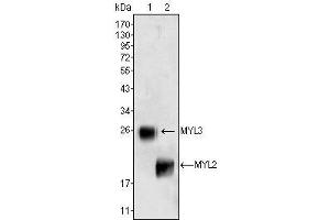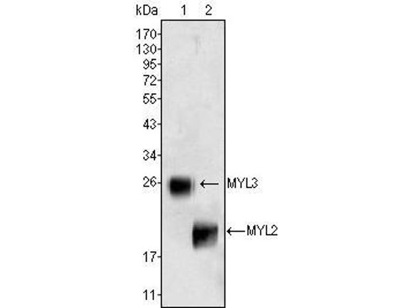 Myosin, light chain 2 (MYL2) encodes the regulatory light chain associated with cardiac myosin beta heavy chain. It is an important protein involved in the regulation of myosin ATPase activity in smooth muscle and Ca+ triggers the phosphorylation of regulatory light chain that in turn triggers contraction. Mutations in MYL2 are associated with mid-left ventricular chamber type hypertrophic cardiomyopathy. Synonyms: Monoclonal MYL2 antibody, Anti-MYL2 antibody, MLC2 antibody, CMH10 antibody, DKFZp779C0562 antibody, Slow cardiac myosin regulatory light chain 2 antibody, MYL2 antibody, Slow cardiac myosin regulatory light chain 2 Cardiac myosin light chain-2 antibody.
