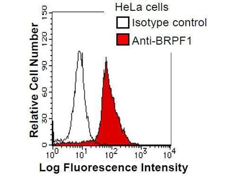 The protein encoded by this gene is expressed ubiquitously and at the highest level in testes and spermatogonia. The protein is localized within nuclei, and it is very similar in structure to two zinc finger proteins, AF10 and AF17. It is suggested that these proteins form a family of regulatory proteins. Two alternatively spliced transcript variants encoding different isoforms have been found for this gene. Synonyms: Monoclonal BRPF1 antibody, Anti-BRPF1 antibody, Bromodomain and PHD finger containing protein antibody, BR140 antibody.