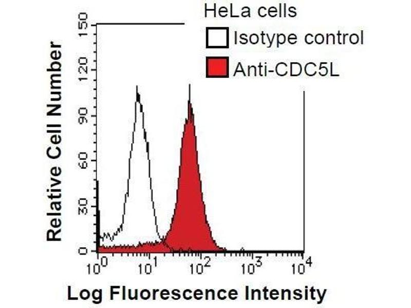 The protein encoded by this gene shares a significant similarity with Schizosaccharomyces pombe cdc5 gene product, which is a cell cycle regulator important for G2/M transition. This protein has been demonstrated to act as a positive regulator of cell cycle G2/M progression. It was also found to be an essential component of a non-snRNA spliceosome, which contains at least five additional protein factors and is required for the second catalytic step of pre-mRNA splicing. Synonyms: Monoclonal CDC5L antibody, Anti-CDC5L antibody, CDC5 cell division cycle 5 -like antibody, CEF1 antibody, hCDC5 antibody, PCDC5RP antibody, KIAA0432 antibody, dJ319D22.1 antibody.