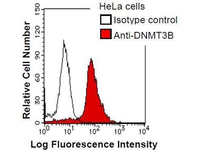 CpG methylation is an epigenetic modification that is important for embryonic development, imprinting, and X chromosome inactivation. Studies in mice have demonstrated that DNA methylation is required for mammalian development. This gene encodes a DNA methyltransferase which is thought to function in de novo methylation, rather than maintenance methylation. The protein localizes primarily to the nucleus and its expression is developmentally regulated. Mutations in this gene cause the immunodeficiency-centromeric instability-facial anomalies (ICF) syndrome. Six alternatively spliced transcript variants have been described. The full length sequences of variants 4 and 5 have not been determined. Synonyms: Monoclonal DNMT3B antibody, Anti-DNMT3B antibody, DNA (cytosine-5-)- methyltransferase 3 beta antibody, ICF antibody, M.HsaIIIB antibody.