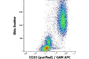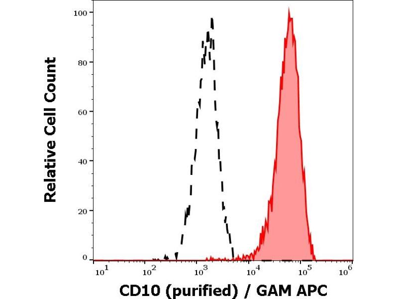 Membrane metalloendopeptidase,CD10 (neutral endopeptidase –, NEP, common acute lymphocytic leukemia antigen –, CALLA, membrane metallo-endopeptidase –, MME, enkefalinase) is a 100- kDa cell surface zinc metalloprotease, cleaving peptide bonds on the N-terminus of hydrophobic amino acids and inactivating multiple physiologically active peptids. CD10 is expressed on various normal cell types, including lymphoid precursor cells, germinal center B lymhocytes, and some epithelial cells, and its expression level serves as a marker for diagnostics of many carcinomas. CD10 is also a differentiation antigen for early B-lymphoid progenitors in the B-cell differentiation pathway and has a key role in regulation of growth, differentiation and signal transduction of many cellular systems.,CALLA, Neprilysin, Neutral endopeptidase, Enkephalinase, Atriopeptidase, MME