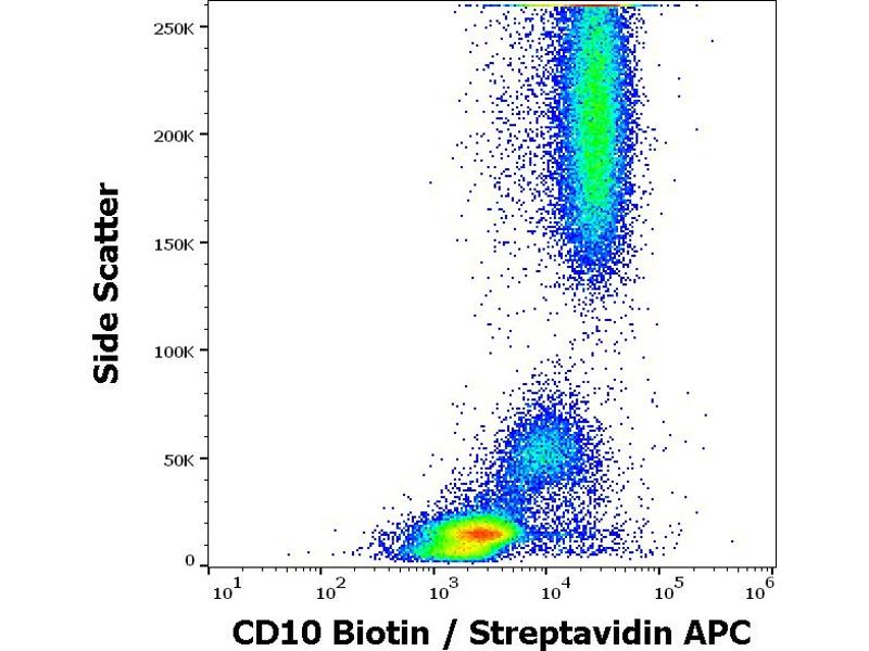 Membrane metalloendopeptidase,CD10 (neutral endopeptidase –, NEP, common acute lymphocytic leukemia antigen –, CALLA, membrane metallo-endopeptidase –, MME, enkefalinase) is a 100- kDa cell surface zinc metalloprotease, cleaving peptide bonds on the N-terminus of hydrophobic amino acids and inactivating multiple physiologically active peptids. CD10 is expressed on various normal cell types, including lymphoid precursor cells, germinal center B lymhocytes, and some epithelial cells, and its expression level serves as a marker for diagnostics of many carcinomas. CD10 is also a differentiation antigen for early B-lymphoid progenitors in the B-cell differentiation pathway and has a key role in regulation of growth, differentiation and signal transduction of many cellular systems.,CALLA, Neprilysin, Neutral endopeptidase, Enkephalinase, Atriopeptidase, MME