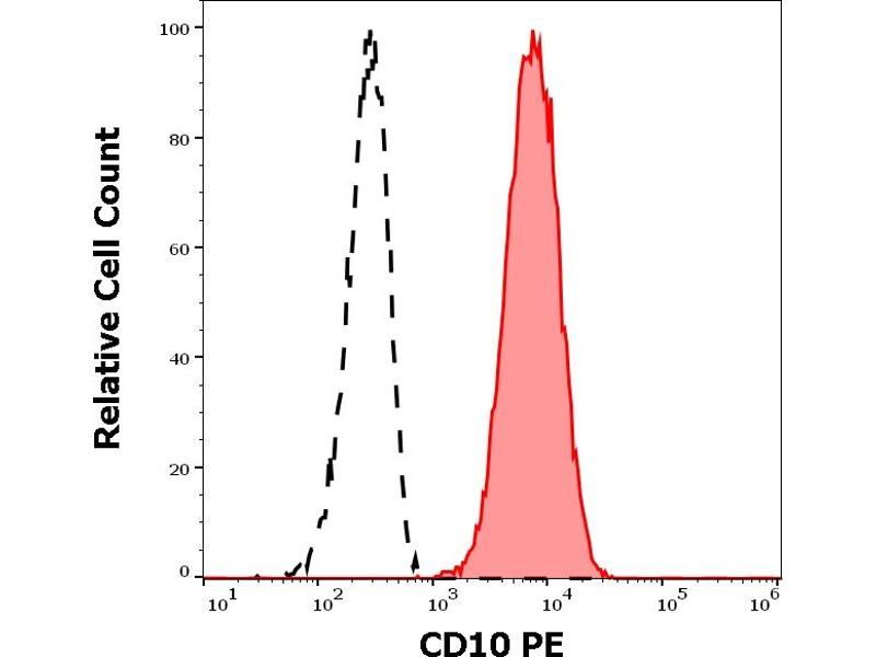 Membrane metalloendopeptidase,CD10 (neutral endopeptidase –, NEP, common acute lymphocytic leukemia antigen –, CALLA, membrane metallo-endopeptidase –, MME, enkefalinase) is a 100- kDa cell surface zinc metalloprotease, cleaving peptide bonds on the N-terminus of hydrophobic amino acids and inactivating multiple physiologically active peptids. CD10 is expressed on various normal cell types, including lymphoid precursor cells, germinal center B lymhocytes, and some epithelial cells, and its expression level serves as a marker for diagnostics of many carcinomas. CD10 is also a differentiation antigen for early B-lymphoid progenitors in the B-cell differentiation pathway and has a key role in regulation of growth, differentiation and signal transduction of many cellular systems.,CALLA, Neprilysin, Neutral endopeptidase, Enkephalinase, Atriopeptidase, MME