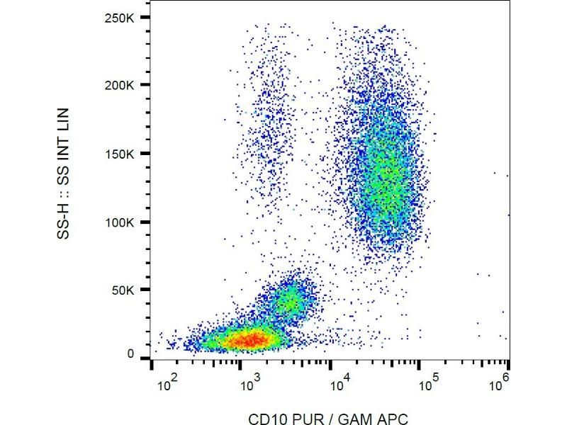 Membrane metalloendopeptidase,CD10 (neutral endopeptidase –, NEP, common acute lymphocytic leukemia antigen –, CALLA, membrane metallo-endopeptidase –, MME, enkefalinase) is a 100- kDa cell surface zinc metalloprotease, cleaving peptide bonds on the N-terminus of hydrophobic amino acids and inactivating multiple physiologically active peptids. CD10 is expressed on various normal cell types, including lymphoid precursor cells, germinal center B lymhocytes, and some epithelial cells, and its expression level serves as a marker for diagnostics of many carcinomas. CD10 is also a differentiation antigen for early B-lymphoid progenitors in the B-cell differentiation pathway and has a key role in regulation of growth, differentiation and signal transduction of many cellular systems.,CALLA, Neprilysin, Neutral endopeptidase, Enkephalinase, Atriopeptidase, MME