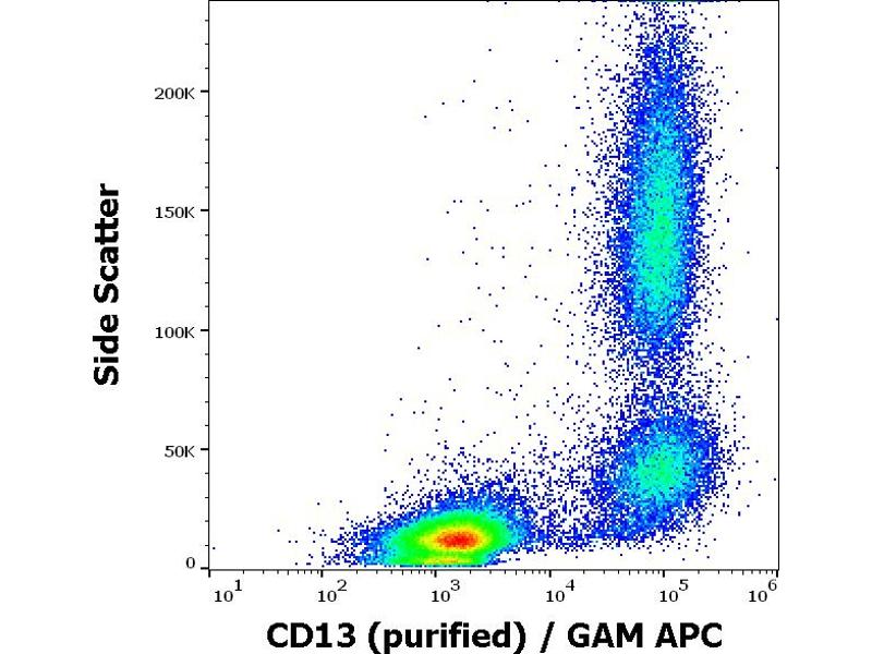 The antibody WM15 recognises an extracellular epitope of human CD13 cell surface glycoprotein, a 150 kDa molecule expressed on granulocytes, endothelial cells, epithelial cells and myeloid progenitors.