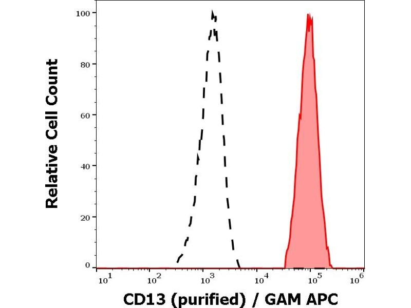 Alanyl aminopeptidase, membrane,CD13 (aminopeptidase N, APN) is a 150 kDa type II transmembrane zinc-binding ectopeptidase expressed on various cell types. This metalloprotease preferentially catalyzes removal of neutral amino acids from small peptides, thus activating or inactivating bioactive peptides. CD13 has also role in extracellular matrix degradation, antigen processing and signal transduction, is important in inflammatory responses, regulates intercellular contact, cell motility and vascularization. CD13 is involved in protection of leukemic cells against apoptosis and its expression associated with poor prognosis of carcinomas.,Aminopeptidase N, APN, PEPN, ANPEP, gp150, LAP1