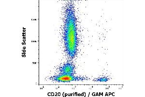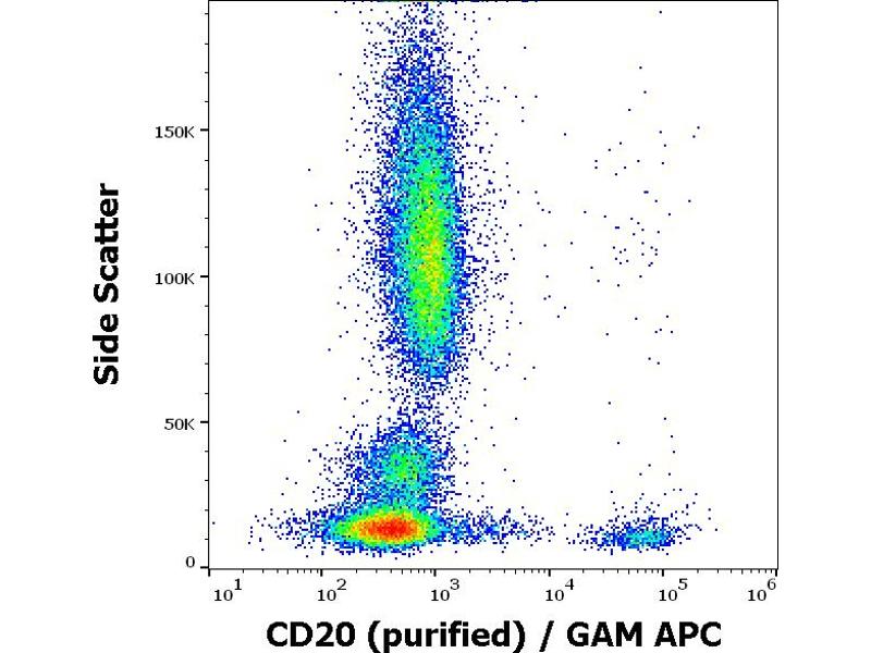 MS4A1,CD20 is a cell surface 33-37 (depending on the degree of phosphorylation) kDa non-glycosylated surface phosphoprotein expressed on mature and most malignant B cells, but not stem cells or plasma cells (low number of the CD20 has been also detected on a subpopulation of T lymphocytes and it can be expressed on follicular dendritic cells). Its expression on B cells is synchronous with the expression of surface IgM. CD20 regulates transmembrane calcium conductance (probably functioning as a component of store-operated calcium channel), cell cycle progression and B-cell proliferation. It is associated with lipid rafts, but the intensity of this association depends on extracellular triggering, employing CD20 conformational change and/or BCR (B cell antigen receptor) aggregation. After the receptor ligation, BCR and CD20 colocalize and then rapidly dissociate before BCR endocytosis, whereas CD20 remains at the cell surface. CD20 serves as a useful target for antibody-mediated therapeutic depletion of B cells, as it is expressed at high levels on most B-cell malignancies, but does not become internalized or shed from the plasma membrane following mAb treatment.,B1, S7, MS4A, Bp35, CVID5, LEU-16