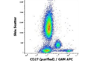 The antibody LT27 reacts with an extracellular epitope of CD27 (T14), a 50-55 kDa type I transmembrane glycoprotein (member of the TNF-receptor superfamily) expressed on medullary thymocytes, peripheral T lymphocytes, some B lymphocytes and NK cells.