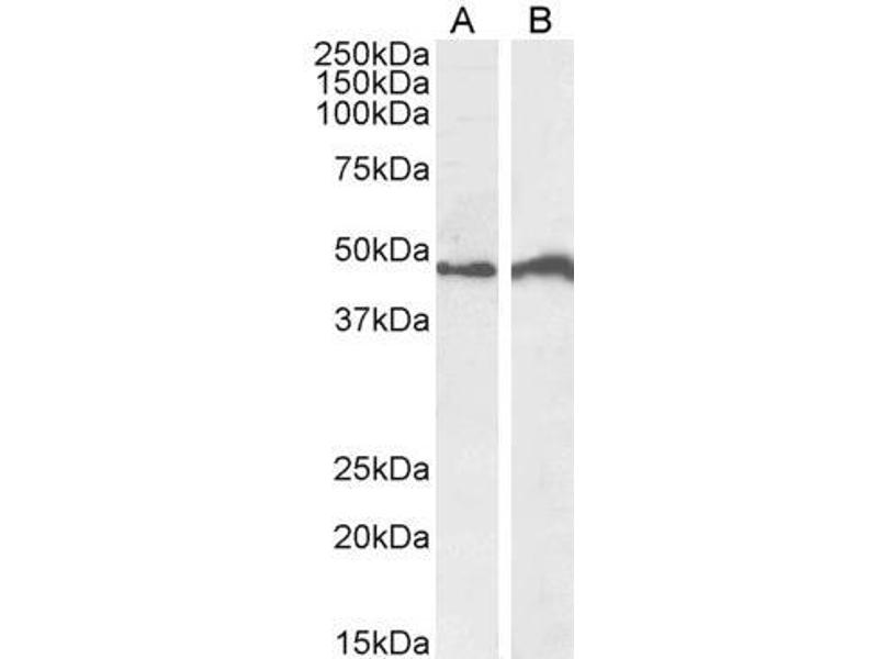 Western Blot: Approx 48 kDa band observed in lysates of cell lines Daudi and Jurkat and approx,48-50 kDa in lysates of cell line NIH3T3 (calculated MW of 51.8 kDa according to Human NP_002451.2 and 51.4 kDa according to Mouse NP_001334437.1). Recommended co