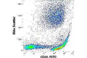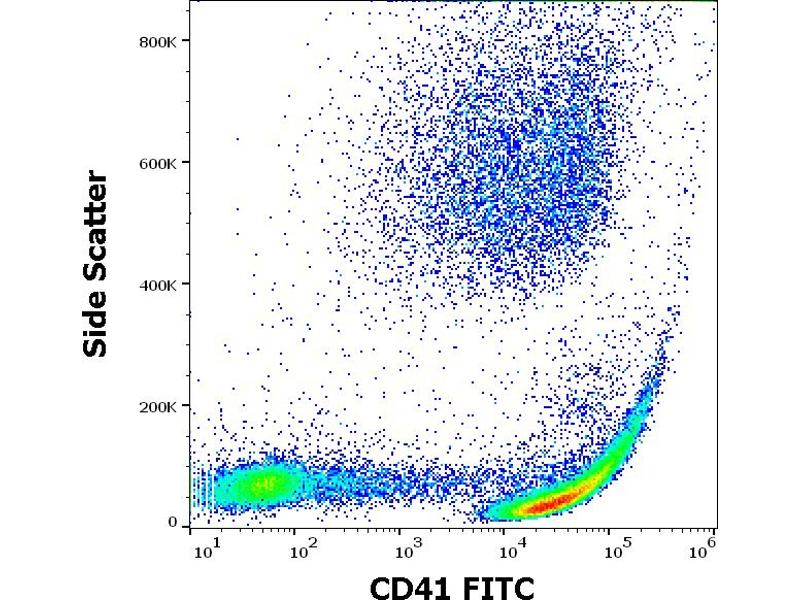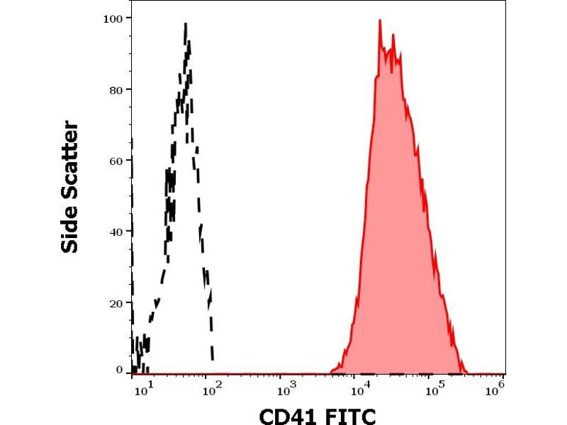 Integrin subunit alpha 2b,CD41 (platelet glycoprotein IIb) is composed of two subunits (120 kDa a, alpha and 23 kDa b, beta) that interact with CD61 in the presence of calcium to form a functional adhesive protein receptor. Upon blood vessel damage, this receptor binds to a variety of proteins including von Willebrand factor, fibrinogen, fibronectin and vitronectin. CD41 is mainly expressed on megakaryocyte-platelet lineage, but generally belongs to the antigens that are expressed during early stages of hematopoietic differentiation.,Platelet GPIIb, Integrin alpha-IIb, GPalpha IIb, GTA