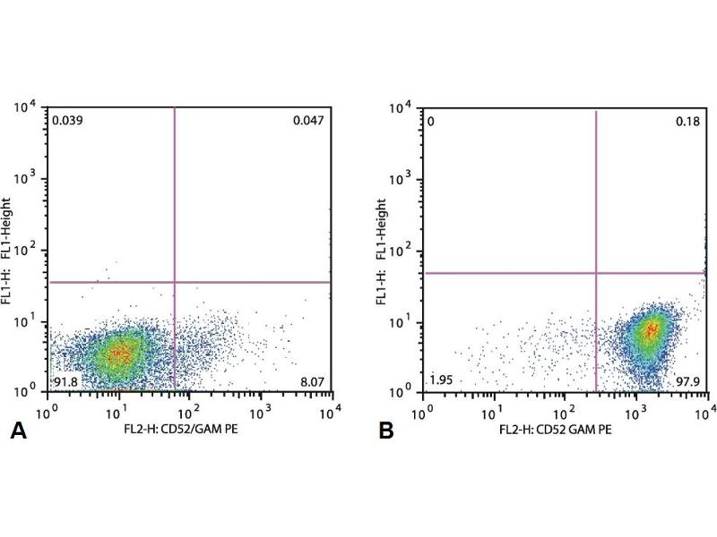 - CD52 Molecule,CD52 (CAMPATH-1, HE5) is a highly glycosylated GPI-anchored 21-28 kDa glycopeptide which is present at high levels on lymphocytes, macrophages, epithelial cells of male reproductive tract and mature sperm. Its 12-amino acid beckbone carries a complex N-linked carbohydrate moiety, which differs between sperm and leukocyte CD52, as well as the GPI anchor does. CD52 can be acquired by sperm cells from seminal plasma, where it is released by epithelial cells. Although CD52 is not an essential T-cell costimulator, its triggering results in activation of normal human T cells. CD52 is a very good target for antibody/complement-mediated cell lysis.,CAMPATH-1, HE5, ESPE5