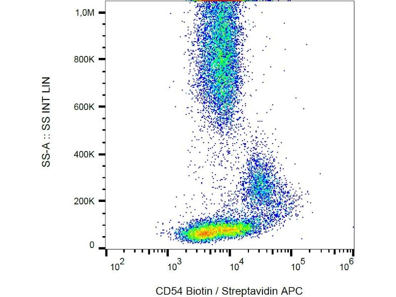 The antibody 1H4 recognizes an extracellular epitope of CD54 (ICAM-1), a 85-110 kDa type I transmembrane glycoprotein (receptor for rhinovirus) expressed on activated endothelial cells, T lymphocytes, B lymphocytes, monocytes, macrophages, granulocytes and dendritic cells, the expression of CD54 is upregulated by activation.