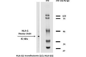 The antibody MEM-G/1 reacts with an extracellular epitope of denaturated HLA-G heavy chain. HLA-G belongs to the MHC Class I molecules (MHC Class Ib, nonclassical) and it is expressed on the surface of trophoblast cells.