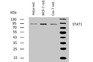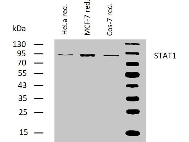 The antibody SM2 recognizes an epitope included within amino acids 8-23 of STAT1, a 91 kDa transcriptional factor involved in a variety of systems including antiviral responses and interferon alpha (IFN-alpha) and gamma (IFN-gamma) signal transduction.