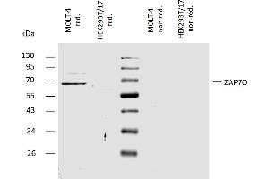 The polyclonal antibody recognizes C-terminal part of human ZAP70 protein tyrosine kinase (intracellular antigen). ZAP70 is a molecule susceptible to degradation. It is recommended to use freshly prepared cell lysates (protease inhibitors are essential) to avoid non-specific staining of degradation products.