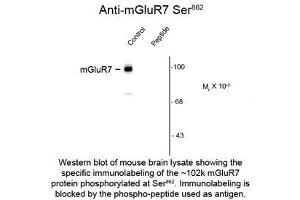- Specific for the ~102k mGluR7 protein phosphorylated at Ser862. Immunolabeling is blocked by preadsorption of antibody with the phospho-peptide used as antigen but not by the corresponding dephosphopeptide.