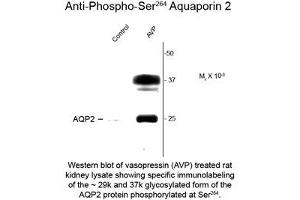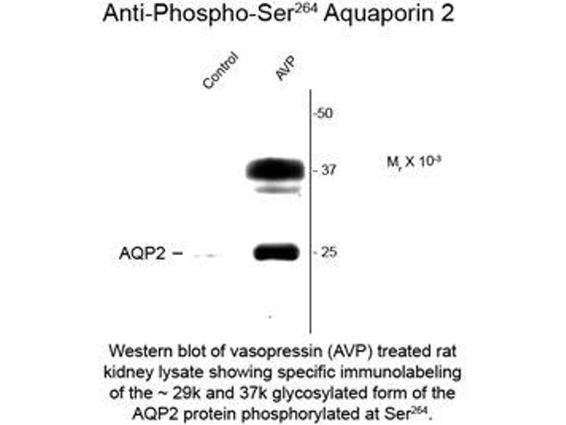 - Specific for the ~29k AQP2 protein phosphorylated at Ser264. Also recognizes the glycosylated form of AQP2 at ~ 37k. Immunolabeling of the AQP2 band is blocked by preadsorption with the phospho-peptide used as antigen but not by the corresponding dephospho-peptide.