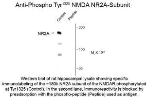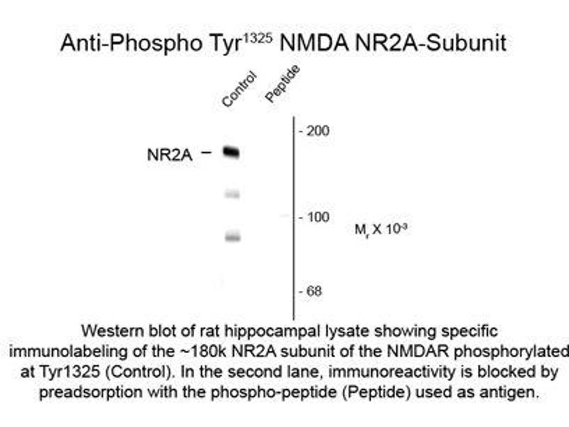- Specific for the ~180k NMDAR NR2A-subunit protein phosphorylated at Tyr1325 in Western blots. Immunolabeling is completely blocked by blocked by the phosphopeptide used as the antigen but not by the corresponding dephosphopeptide.