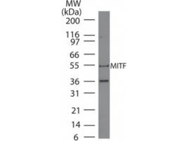 Mitf produces, by alternative splicing, 10 different transcripts, all with introns, putatively encoding 10 different protein isoforms. Therefore, observed molecular weights may vary depending on MITF isoforms expressed. Users are encouraged to utilize the peptide immunogen sequence to gain further information about the isoforms recognized by the antibody.