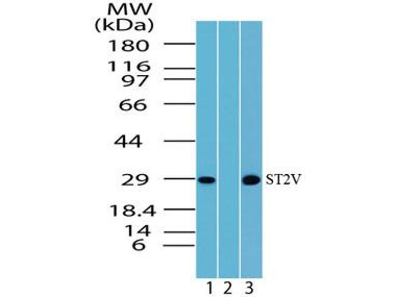 A synthetic peptide corresponding to amino acids 207-220 (QSFCKLKKSLIFSN) of human ST2V, GenBank no BAA85894. Percent identity with other species by BLAST analysis: Human (100%).