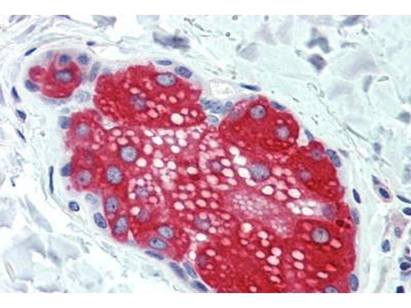 Usage: Immunohistochemistry: This antibody was validated for use in immunohistochemistry on a panel of 21 formalin-fixed, paraffin-embedded (FFPE) human tissues after heat induced antigen retrieval in pH 6.0 citrate buffer. After incubation with the primary antibody, slides were incubated with biotinylated secondary antibody, followed by alkaline phosphatase-streptavidin and chromogen. The stained slides were evaluated by a pathologist to confirm staining specificity. The optimal working concentration for this antibody was determined to be 15 μg/mL. -