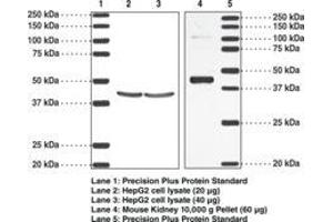 - Consistently detects the TP receptor at 55 and 64 kDa in platelet, kidney, and Cos-7 cell samples.