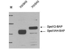 - This antiserum detects the minimal peptide substrate (GLNDIFEAQKIEWH) for the E. coli biotin ligase tag (BLT of BirA. This peptide is also called the biotin acceptor peptide (BAP) of the biotin carboxyl carrier protein (BCCP) subunit of acetyl CoA carboxylase of E. coli. Western blot analysis of B. subtilis strains producing either (BAP-tagged) SPoIIIAH (XWB49) or (BAP-tagged) SpoIIQ (XWB46) showed strong and specific reactivity to the antisera. Minor background bands of unknown identity may be observed. The antisera will recognize the BAP/BLT tag irrespective of the whether the tag is biotinylated (data not shown).