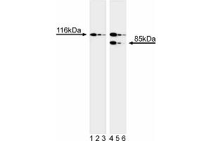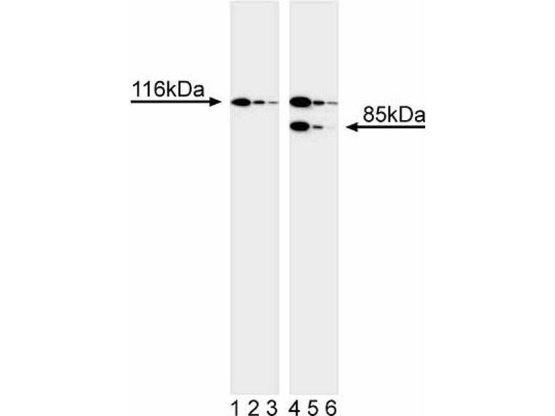 - 116 kDa (full-length), 85 kDa (cleaved)