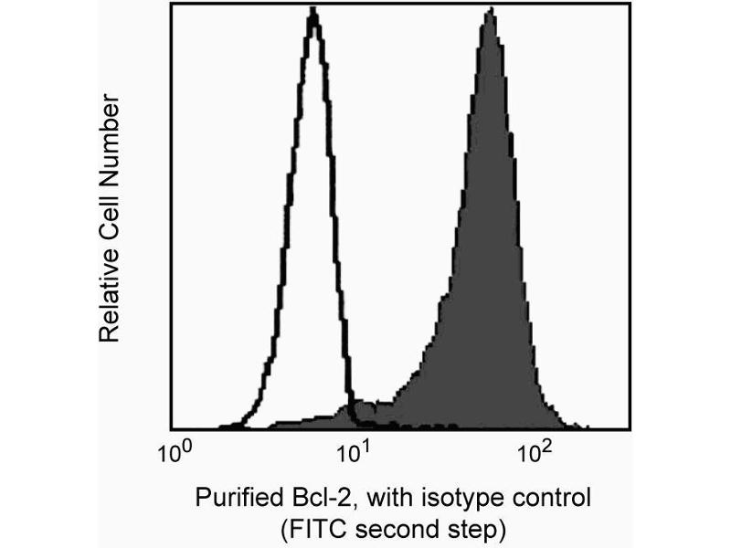 - Bcl-2 is considered to be novel among proto-oncogenes because it blocks apoptosis (programmed cell death) in many cell types. Apoptosis is an active form of cellular suicide that typically requires new RNA and protein synthesis and is associated with distinct morphological changes including cell shrinkage, cytoplasm membrane blebbing, nuclear fragmentation and DNA degradation. Because Bcl-2 blocks apoptosis it may contribute to tumorigenisis by prolonging cell survival, rather than by accelerating the rate of cell proliferation. Human Bcl-2 protein migrates at a molecular weight of ~26 kDa by SDS-PAGE. Bcl-2/100 recognizes a 26 kDa band representing human Bcl-2. Additional minor bands at 27-31 kDa and 18-21 kDa may also be visualized. The 27-31 kDa upper band may represent a larger isoform, whereas the 18-21 kDa lower band may be an internal translation or proteolytic product, therefore, a synthetic peptide corresponding to amino acids 41-54 (GAAPAPGIFSSQPG) of human Bcl-2 was used as immunogen. This peptide sequence is not conserved between human and mouse. Bcl-2/100 does not cross-react with mouse Bcl-2. For detection of mouse Bcl-2 refer to clone 3F11 (ABIN967441), polyclonal rabbit anti-rat/mouse Bcl-2 antiserum, and polyclonal rabbit anti-mouse Bcl-2 antiserum.