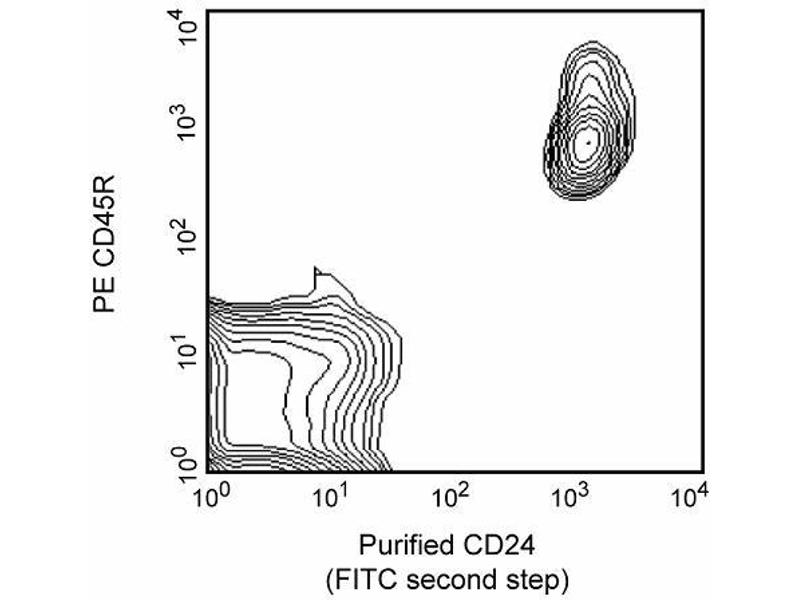 The HIS50 antibody reacts with CD24 (Heat-Stable Antigen, HSA or HsAg), a variably glycosylated GPI-anchored membrane protein. In the rat, Cd24 mRNA is found in a variety of epithelia, neural tissue, lymph node germinal centers, and thymus. mAb HIS50 detects CD24 on most B-lineage cells in the bone marrow, on most sIgM[high] B lymphocytes in the blood and spleen, and on marginal-zone B cells in the spleen and lymph node. Variable levels of CD24 are detected on sIgM[dull] and follicular B lymphocytes. mAb HIS50 does not detect CD24 on rat thymocytes nor peripheral T lymphocytes, NK cells, or granulocytes. The HIS50 antibody cross-reacts with intracellular antigen(s) in human lymphocytes. Synonyms: Heat-Stable Antigen