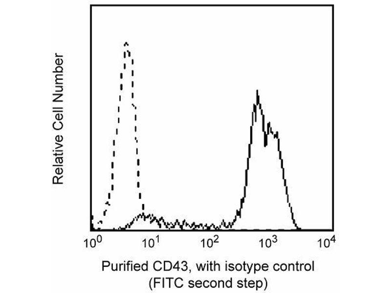 Anti-leukosialin monoclonal antibody (clone L60) recognizes a sialic acid-dependent determinant on leukosialin, a strongly anionic, highly o-linked glycosylated cell surface protein with a 45 nm extracellular domain. Leukosialin, also know as sialophorin or CD43, is a major component of T lymphocyte, thymocyte, and neutrophil (PMN) membranes, and is also expressed on many different cells including monocytes, platelets, bone marrow stem cells, and plasma cells.